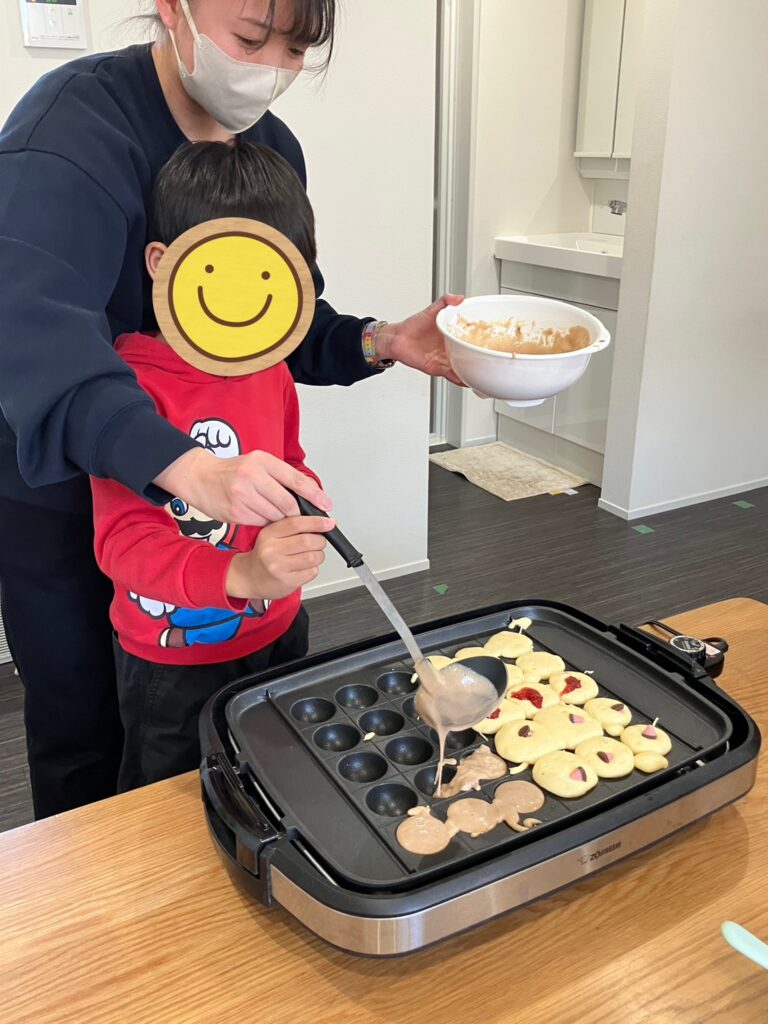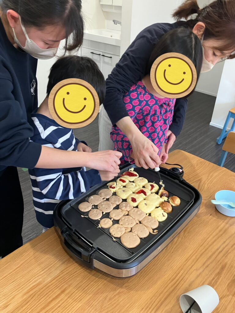 やけどに注意しながら、1人3個ずつ生地を流し入れていきます!