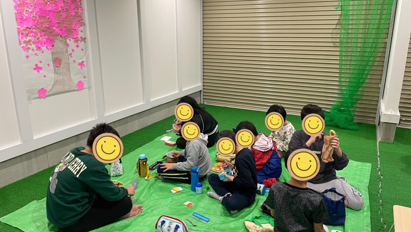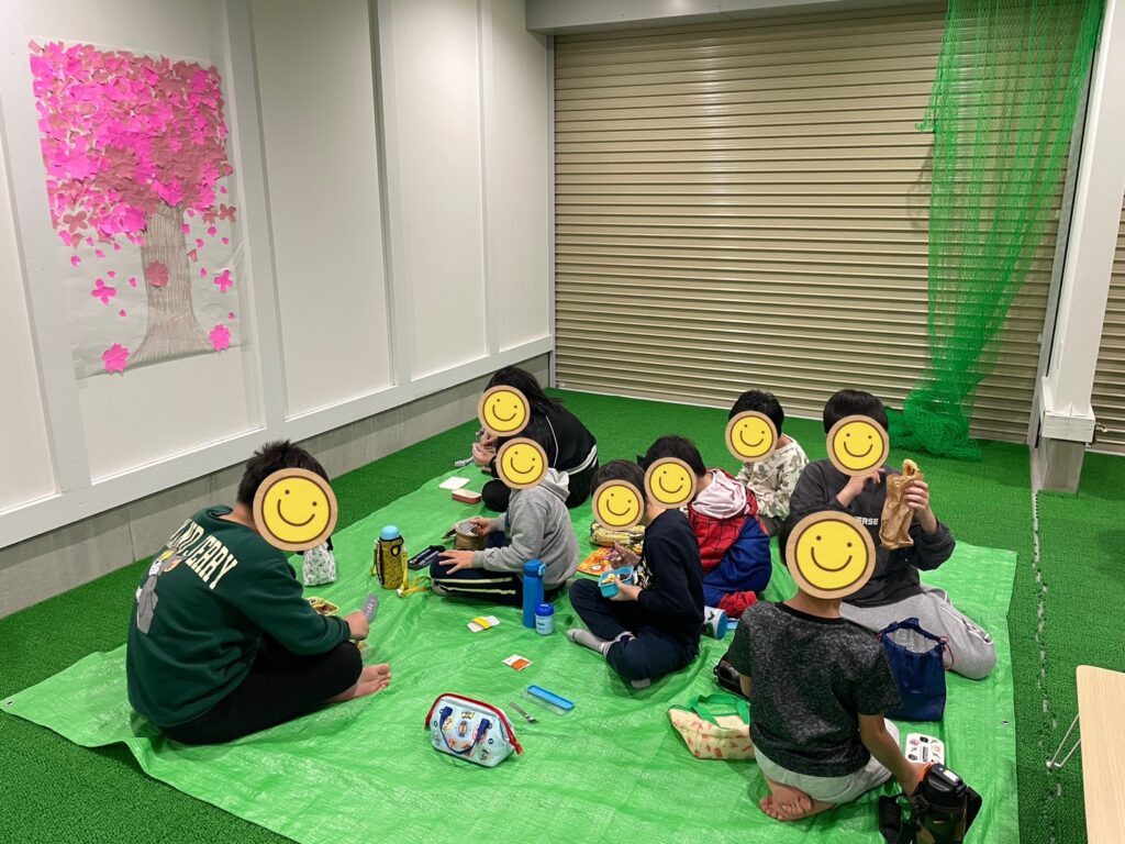 最後は完成した桜の木の前にお花見気分でレジャーシートを敷き、おやつを食べました!