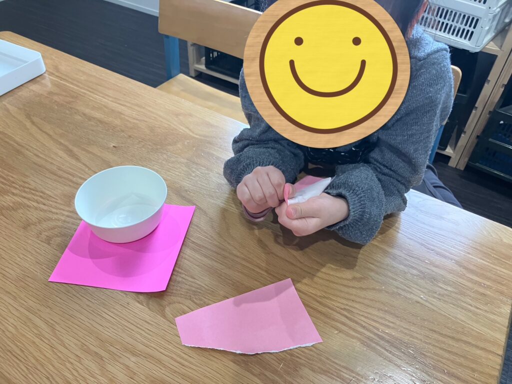まずはピンクの折り紙をたくさんちぎります😊
