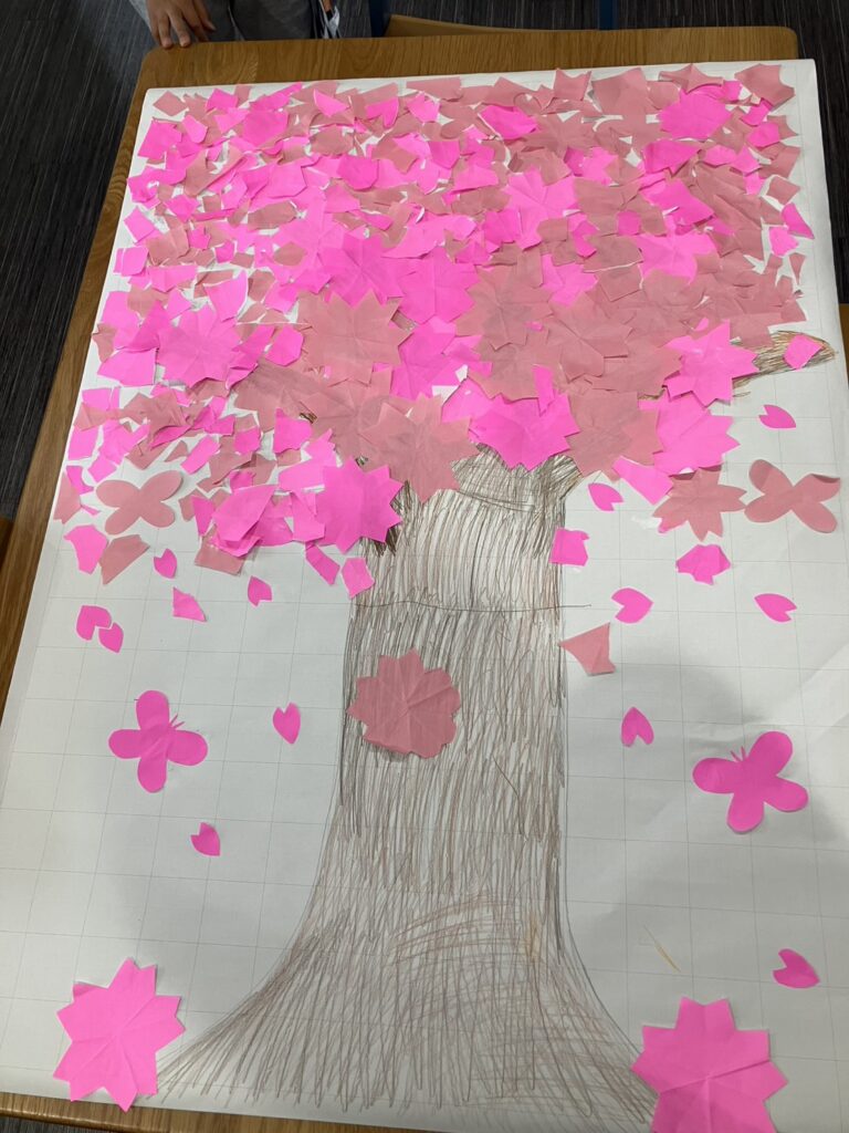 こちらはピンクの折り紙をちぎり、桜の木に貼り付けました!