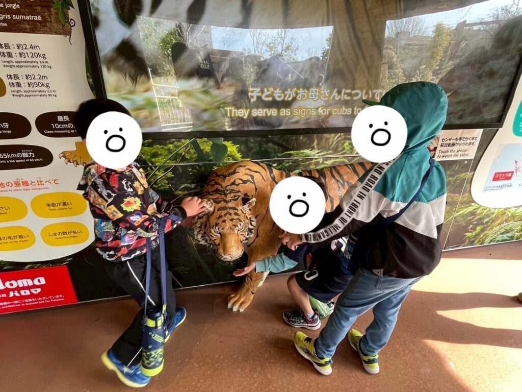 恐る恐るトラの置物と触れ合うお友だち🐅