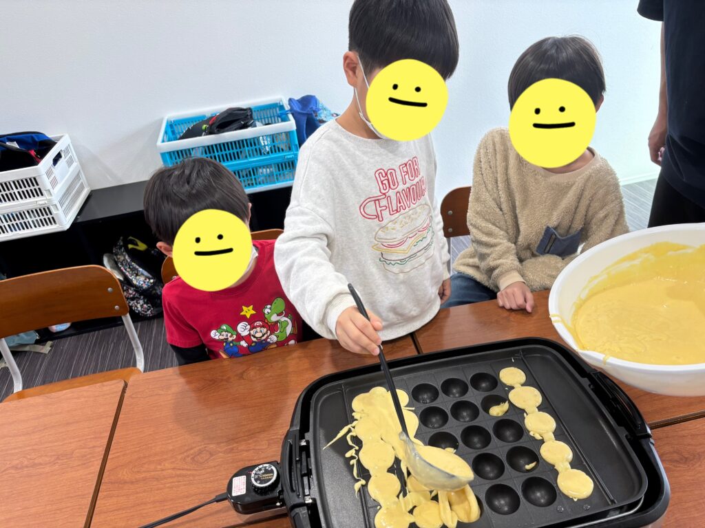 鉄板に生地を流し込んだら、みんなで具材を入れよう😁
