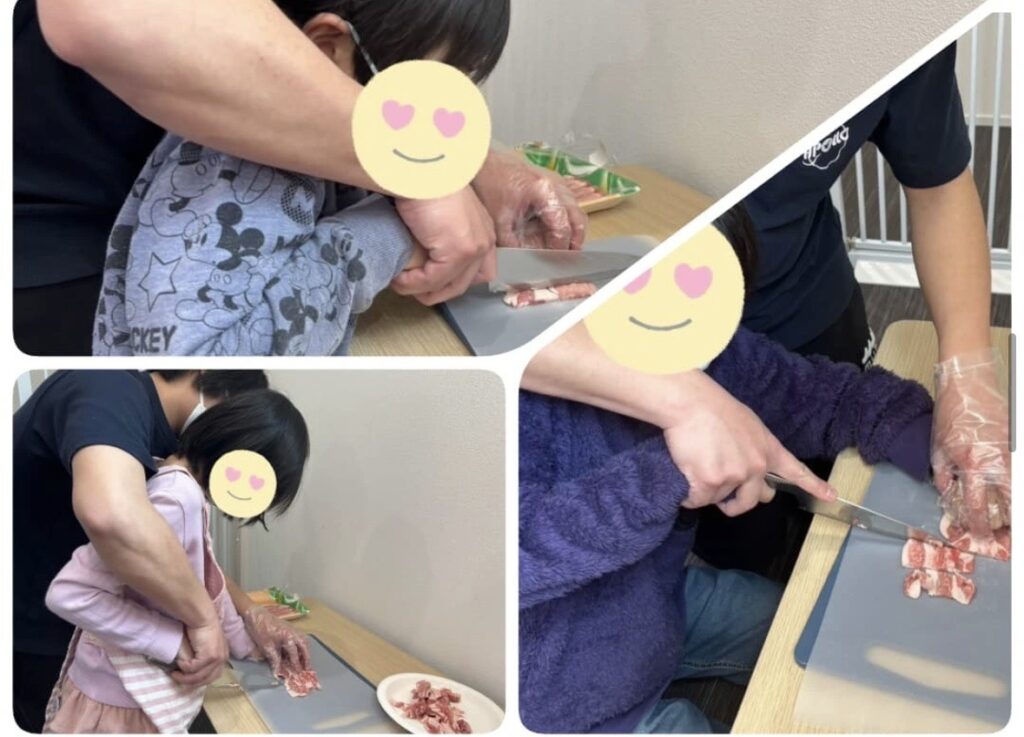 先ずは、食材を切っていきます。「添える手を猫の手にして。」スタッフと一緒に切りました。