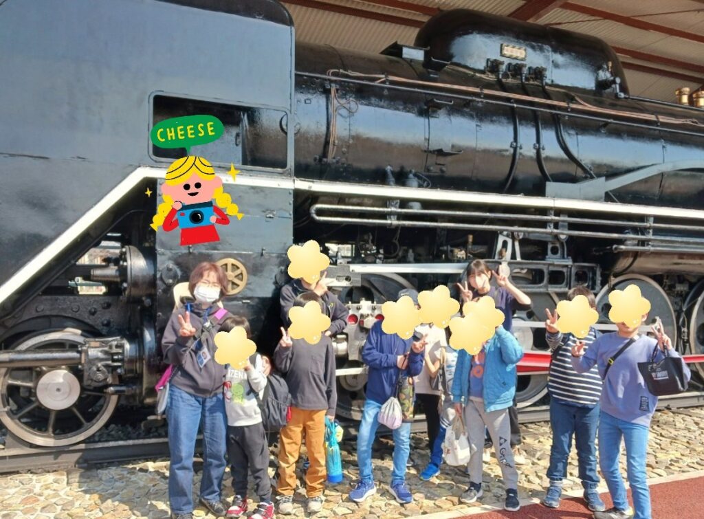 大きな汽車🚂の前で「はい、ポーズ🤗」みんなで記念撮影をしました✨