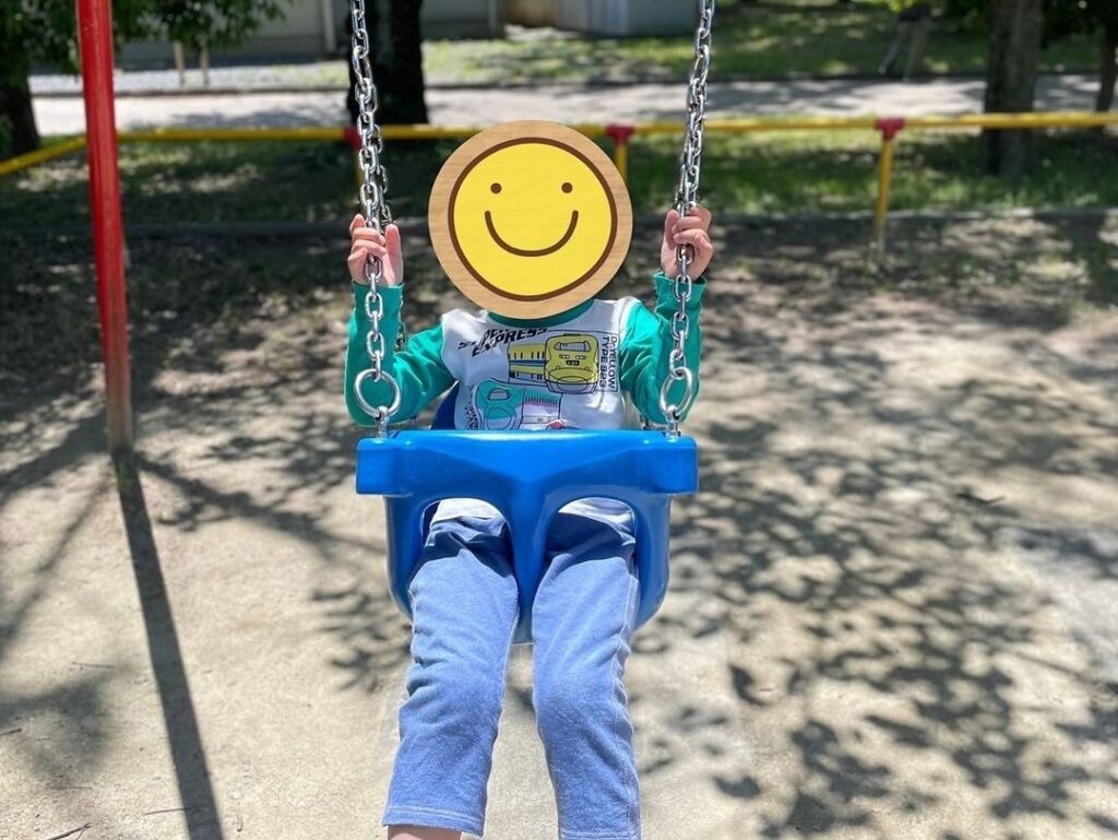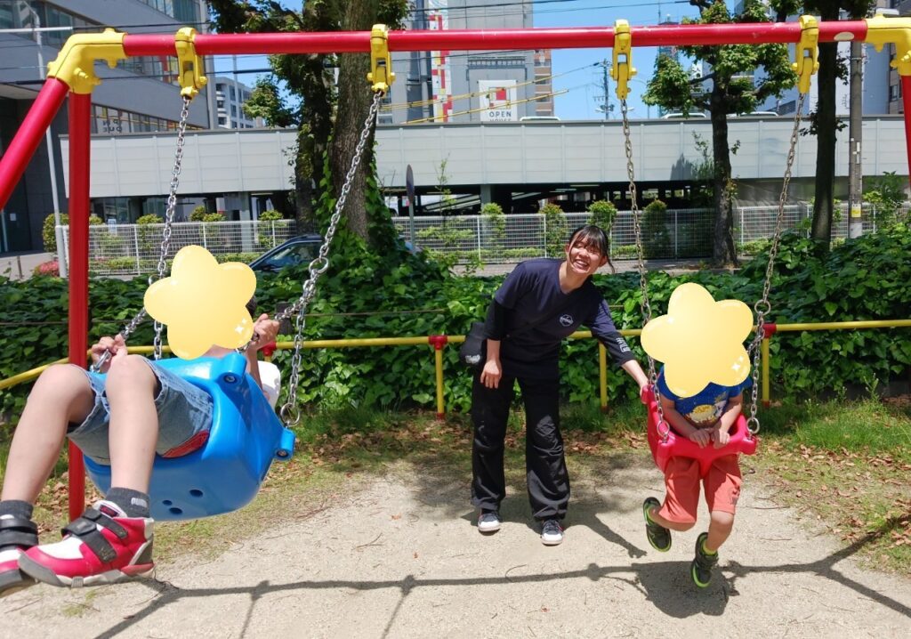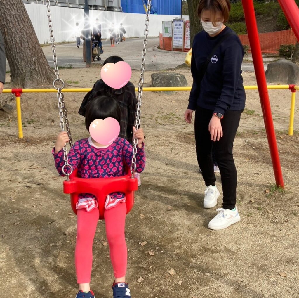 ブランコを楽しんでいるお友だちはスタッフに「押して💕」とお願い。交互にお友だちを後ろから押すのでスタッフはちょっとおつかれ😥