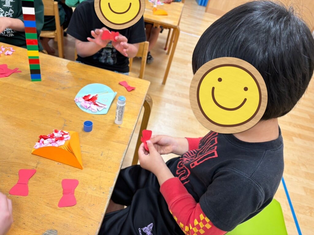 赤とピンク、2色の折り紙をちぎって丸めています✨
