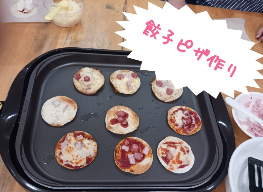 出来上がったピザを食べて「美味しい😋」と笑顔をがこぼれました。