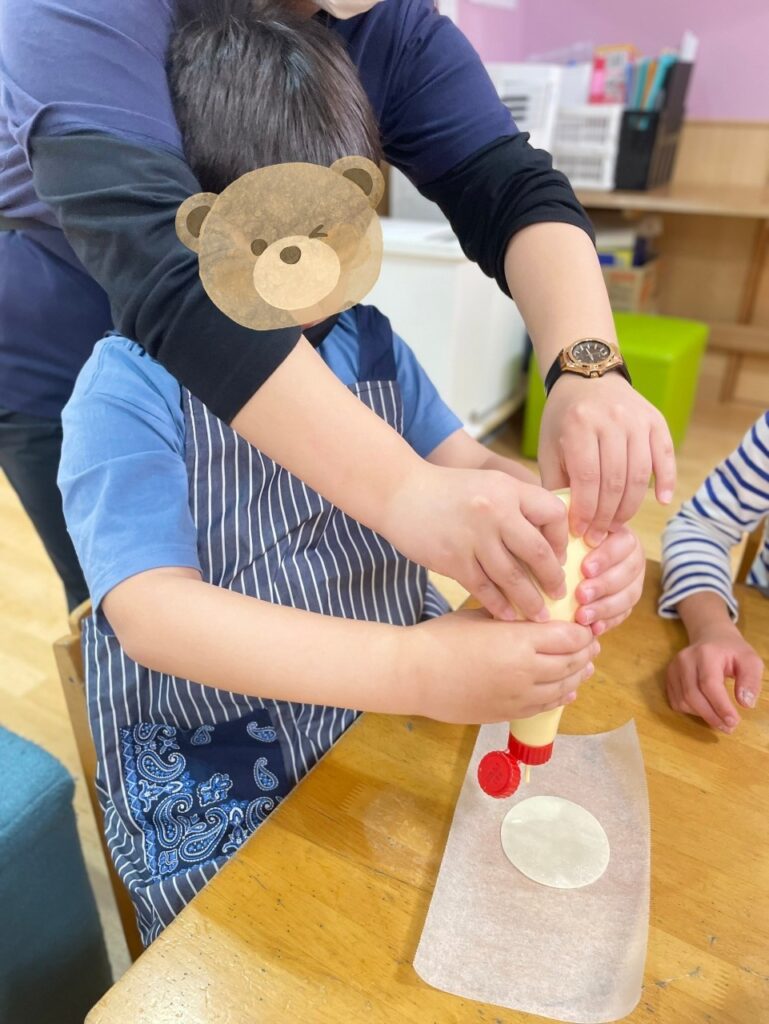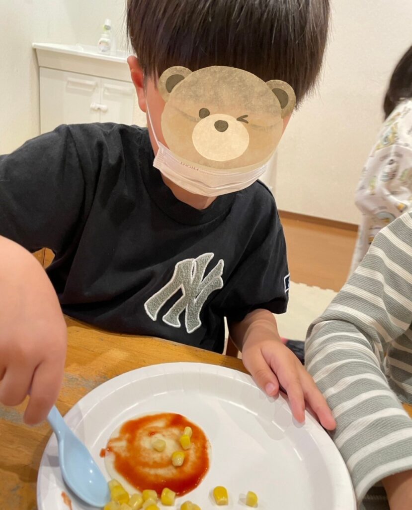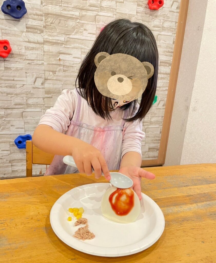 自分の好きな具材をのせていきます😊「ケッチャプにする!」「マヨネーズにしようかな」と思い思いに具材をのせます🍴