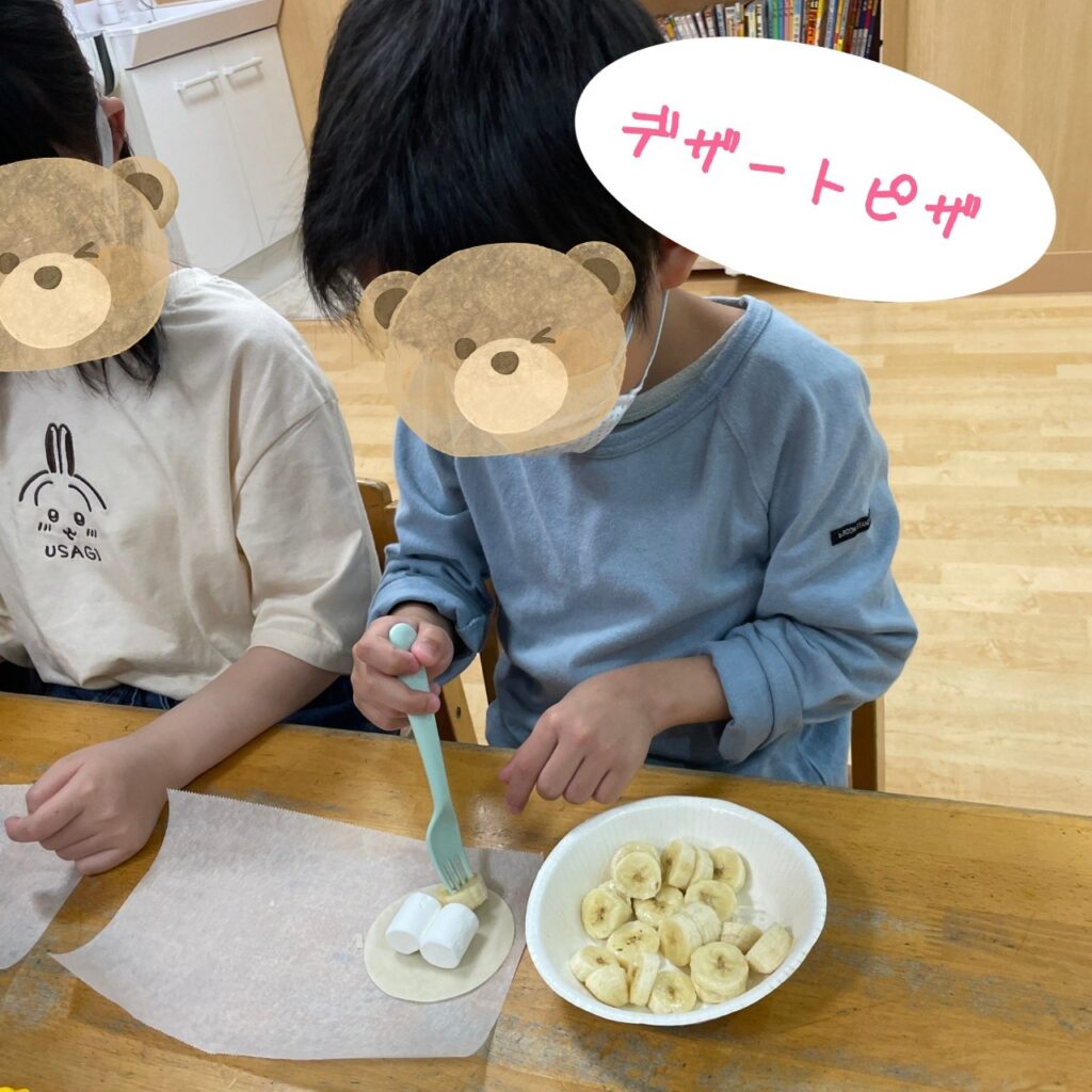 「甘いの作ろう🎵」とバナナやマシュマロをのせるお友だち