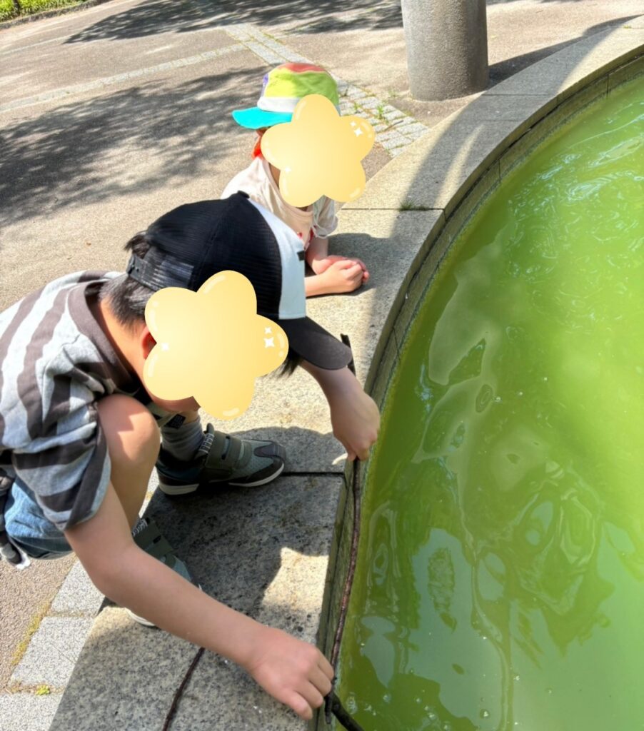 公園には大きな噴水があり「何かいるかな?」と覗いているお友だち。
