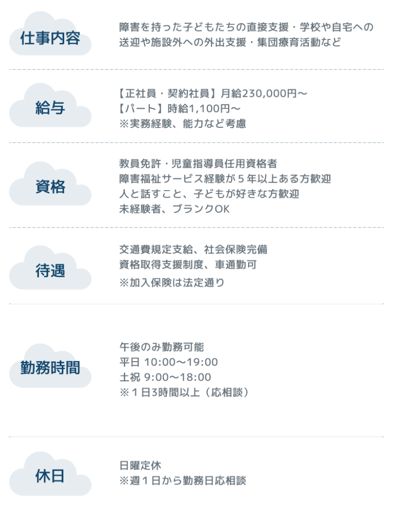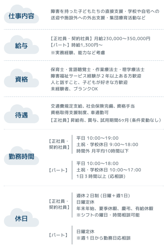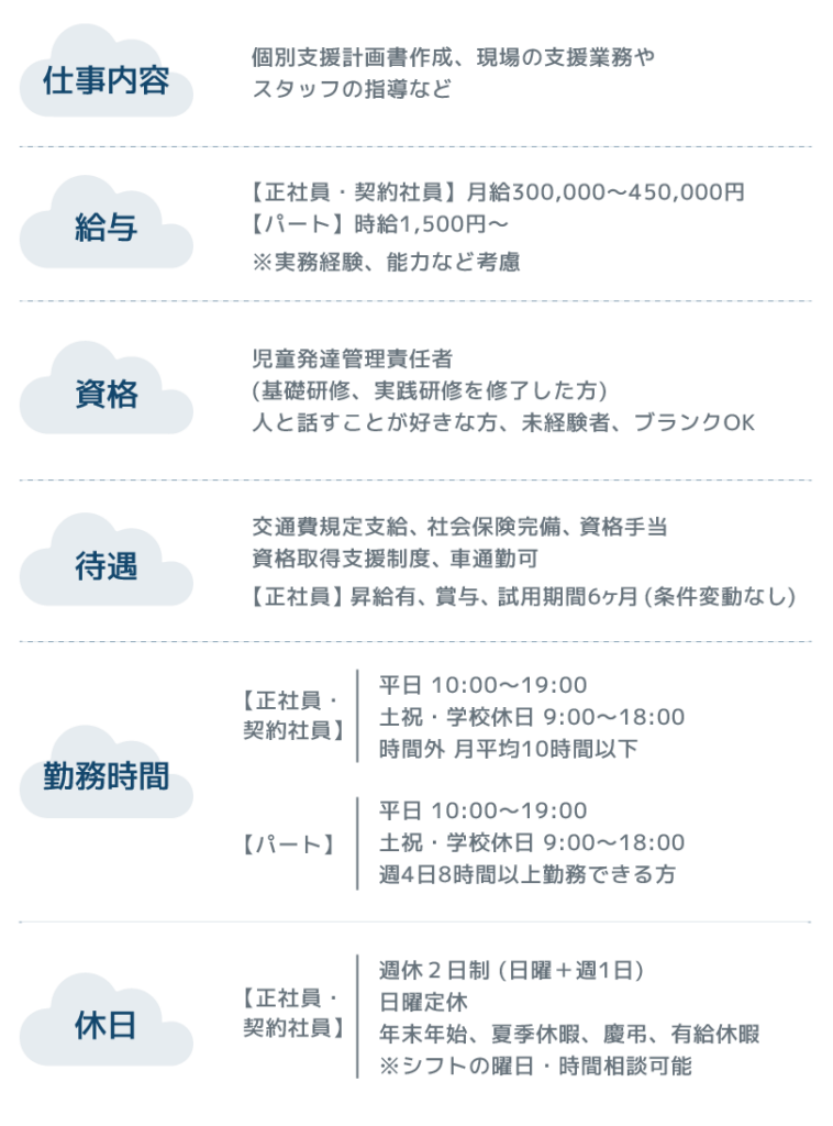 あぽろキッズで一緒に働きませんか? 事業拡大の為スタッフ大募集!! あぽろキッズで一緒に働きませんか? 事業拡大の為スタッフ大募集!! 募集要項 募集要項 児童発達支援管理責任者 (正社員・契約社員・パート) 専門職員(保育士・ST・OT・PT) (正社員・契約社員・パート) 児童指導員 (正社員・契約社員・パート) お問い合わせ